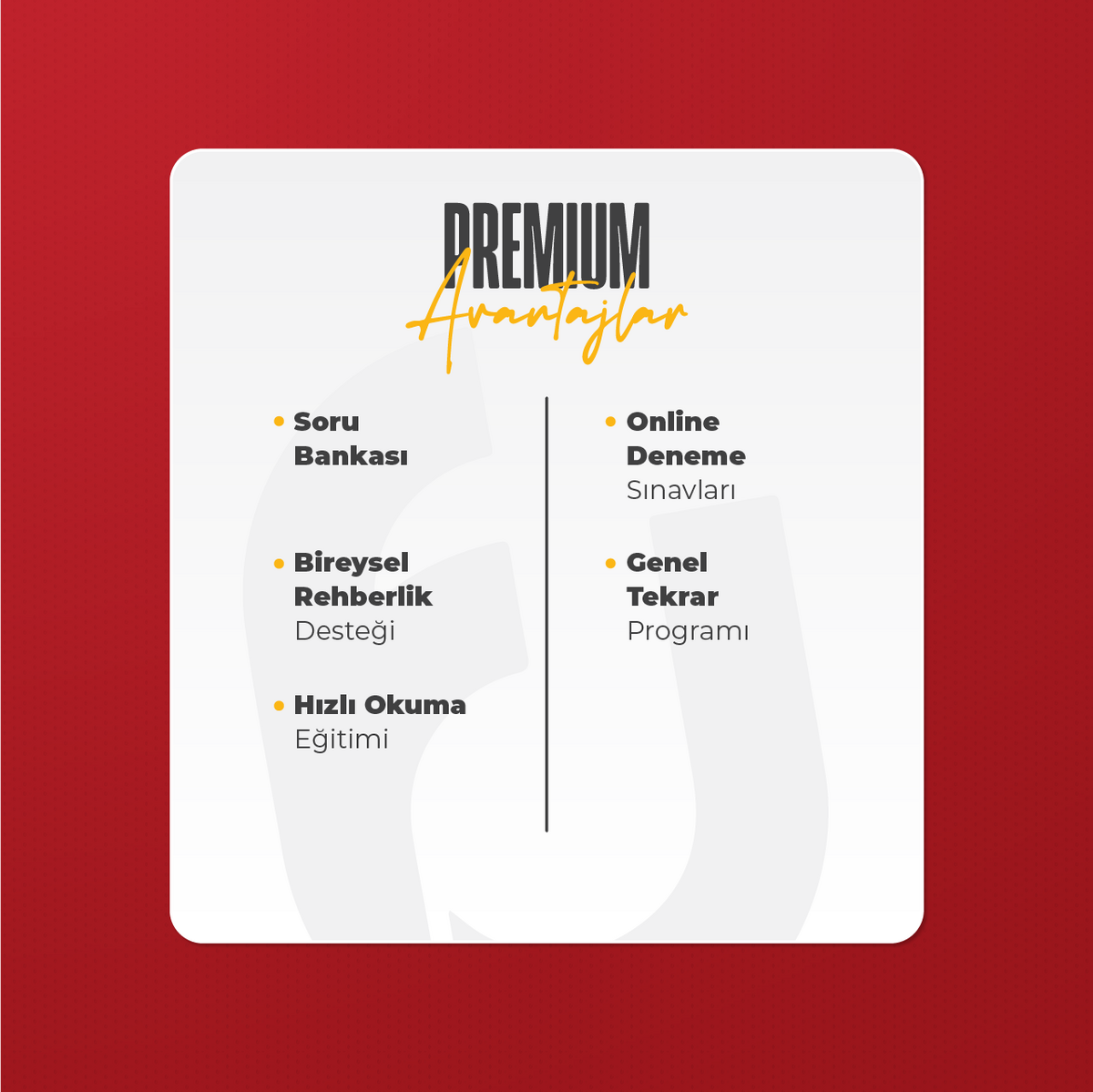Farklı Rehberlik birimi tarafından eğitim türünüze özgü olarak haftalık rehberlik semineri belirtilen gün ve saatte grubunuza yönelik olarak canlı şekilde gerçekleştirilecektir. Seminere canlı şekilde katılarak ya da video kayıtlarını izleyerek gerekli yönlendirmeleri alabilirsiniz. Ayrıca öğrencilerimizin ilgili sınav tarihine kadar geçerli olmak üzere toplam 5 defa bireysel görüşme bulunmaktadır.