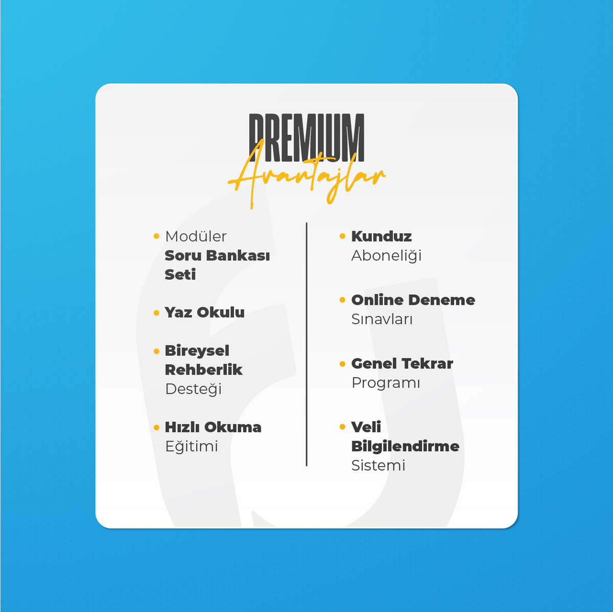 Farklı Rehberlik birimi tarafından eğitim türünüze özgü olarak haftalık rehberlik semineri belirtilen gün ve saatte grubunuza yönelik olarak canlı şekilde gerçekleştirilecektir. Seminere canlı şekilde katılarak ya da video kayıtlarını izleyerek gerekli yönlendirmeleri alabilirsiniz. Ayrıca öğrencilerimizin ilgili sınav tarihine kadar geçerli olmak üzere toplam 25 defa bireysel görüşme bulunmaktadır. Bu haklar 1 Eylül 2025 tarihi itibari ile başlayacak ve ilgili sınav tarihine kadar geçerli olacaktır.