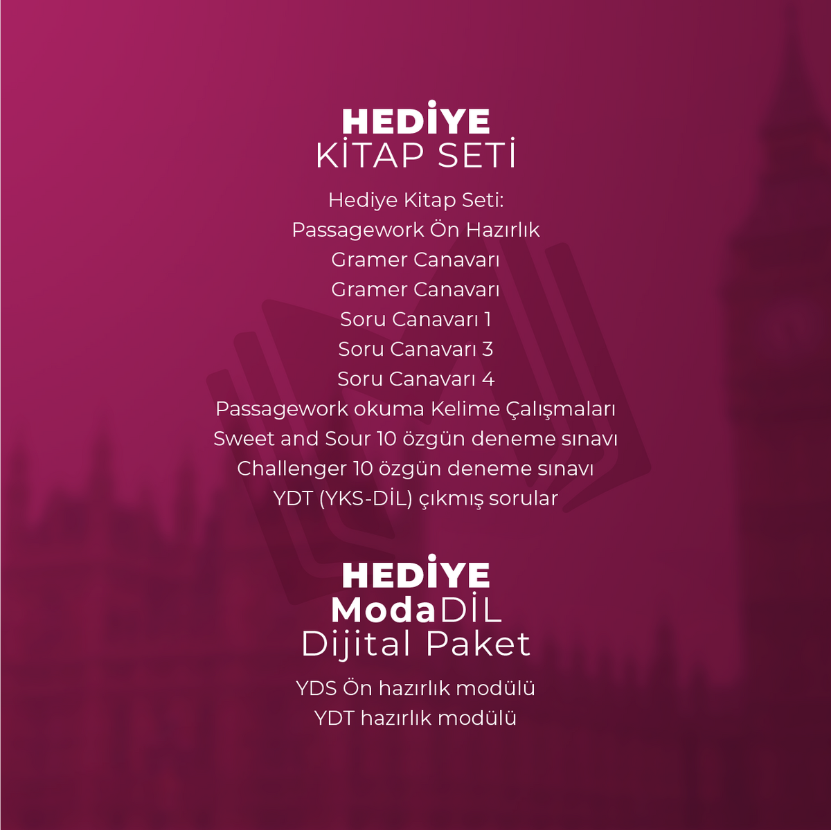 Programımıza kayıt olan öğrencilere MODA DİL'in hazırlamış olduğu 14.350 TL değerindenki YDT ( YKS-DİL) Dijital Paketi hediye edilecektir. Dijital paket tanımlaması kayıt tarihinde aktif edilip sıınav tarihine kadar kullanılabilecektir.